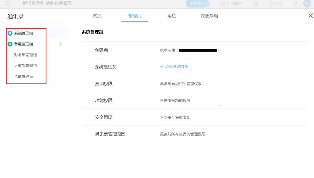 【系统管理员】和【创建者】能够对【普通管理员】进行授权及权限设置,并根据不同需求对【普通管理员】分组。