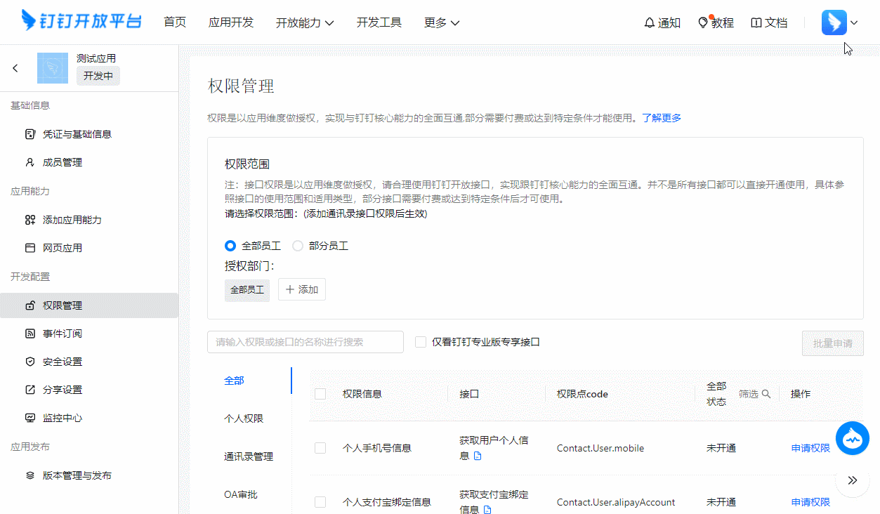 - 在【个人权限】勾选个人手机号信息、通讯录个人信息读权限两个权限,勾选好后点击【批量申请】