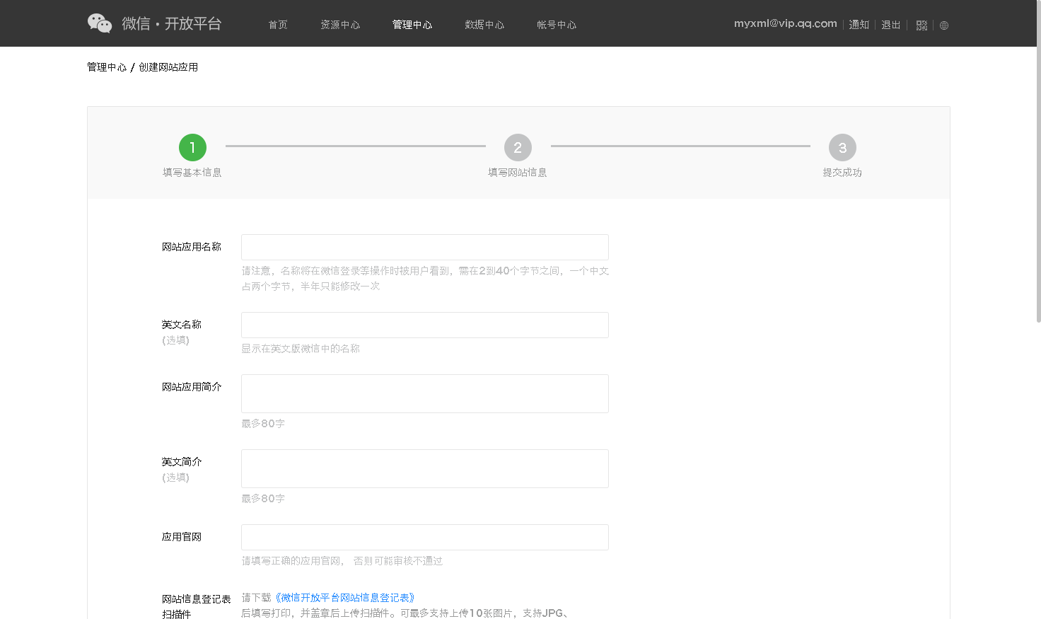 在绑定公众号之后,需创建网站应用后进行后续操作;