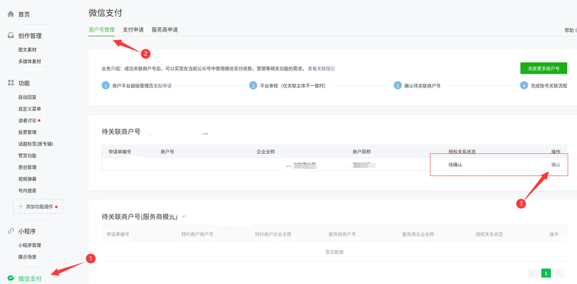 2.2、提交审核申请后,需要在微信公众平台->微信支付->商户号管理->待关联商户号->确认,授权关系状态刷新为正常后,即表示绑定成功