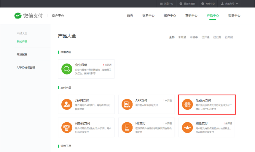4.1、进入微信商户平台->产品中心中->我的产品,开通Native支付功能