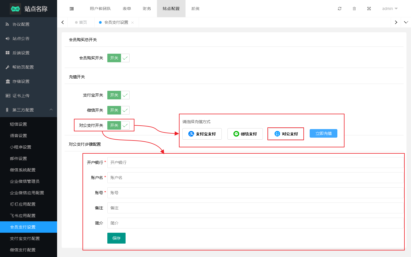 对公支付对应当前页面对公支付以及下方对公支付步骤配置设置内容。