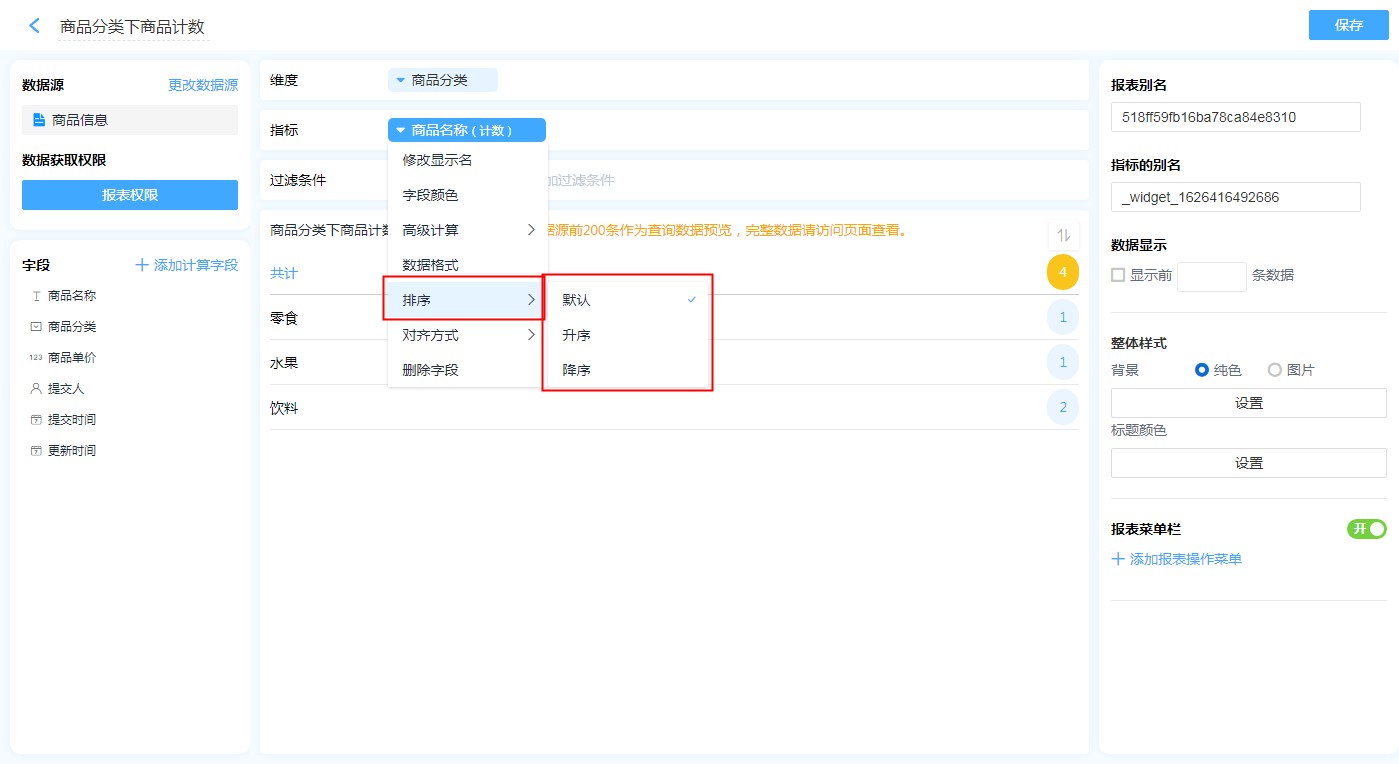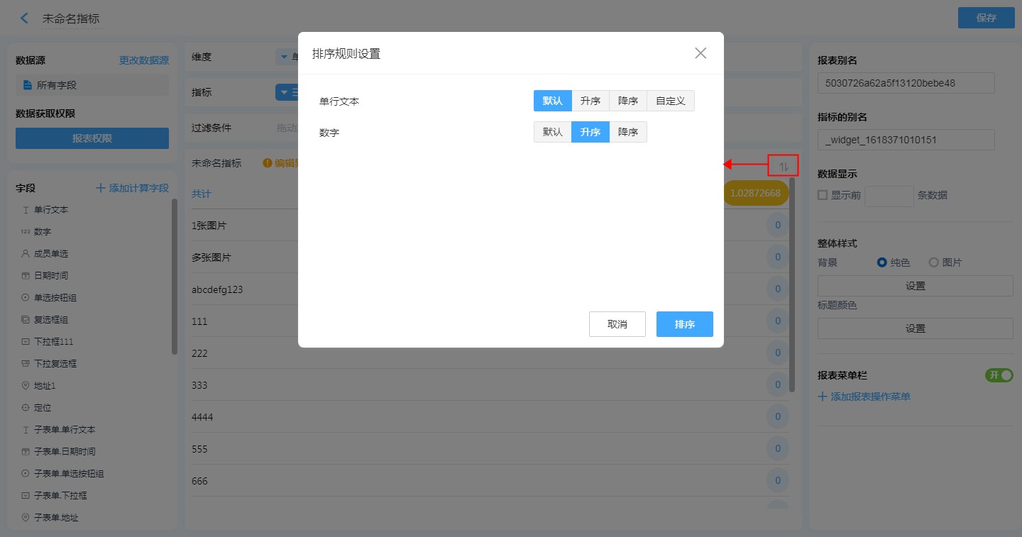 (1)在维度或者指标字段上进行排序设置。