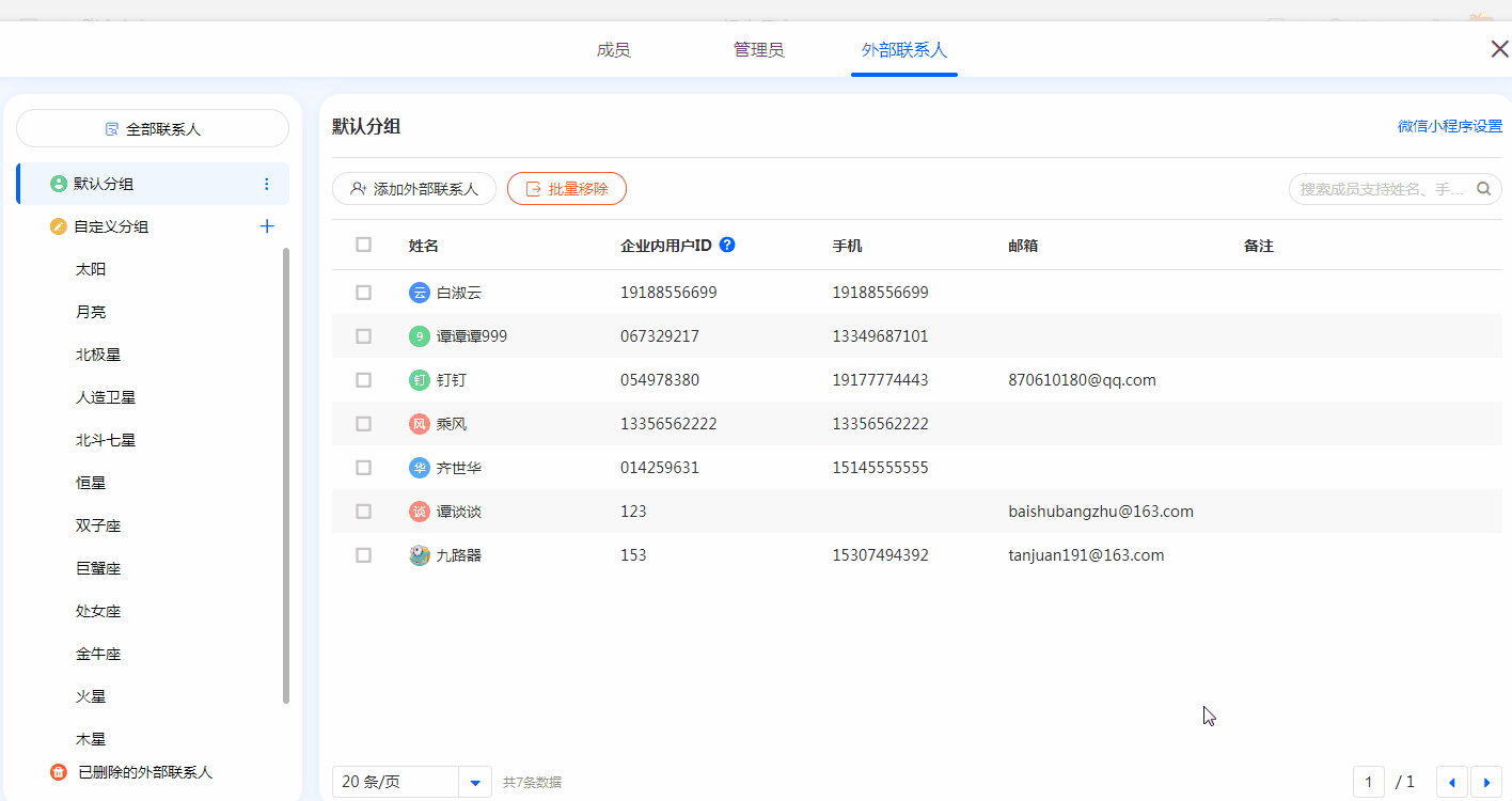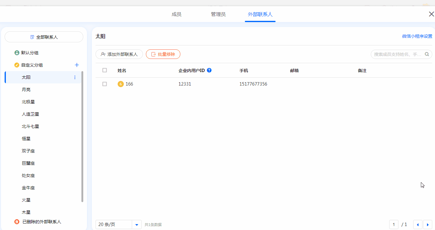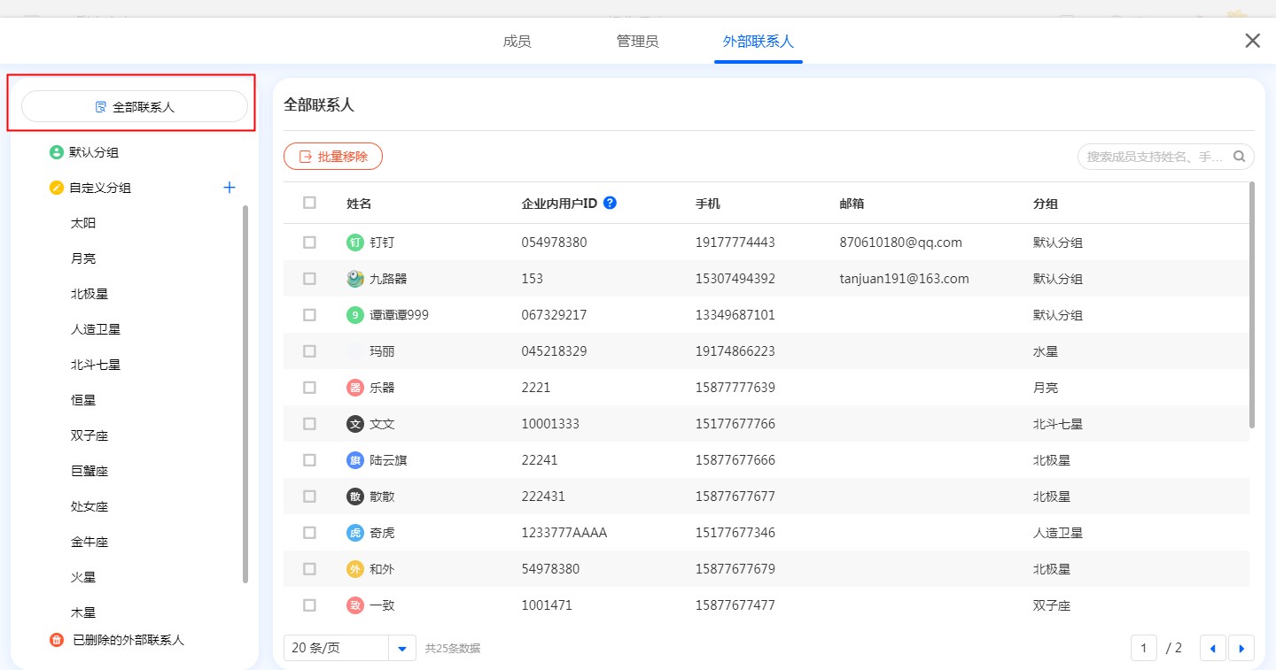 支持对当前分组内的外部联系人,按姓名、手机、邮箱进行模糊搜索。