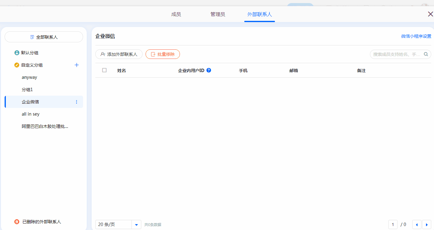 管理员在外部联系人-分组-小程序设置中,获取二维码,外部人员扫码此二维码即可加入团队,并加入该分组内。