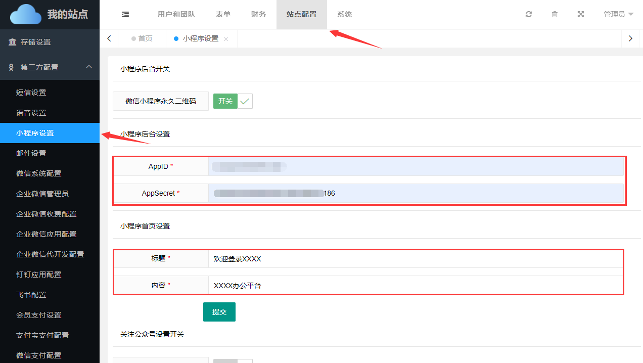操作路径:私有云站点后台 -> 站点配置 -> 第三方配置 -> 小程序设置