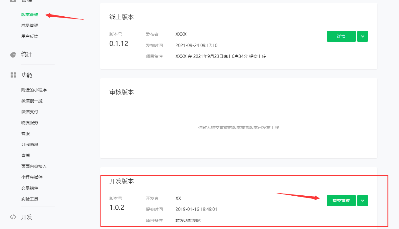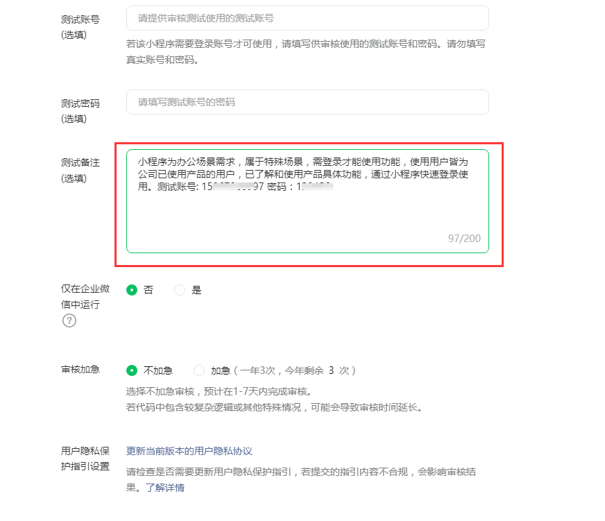 版本描述可随意填写,如:初版发布测试备注请填写下方内容:小程序为办公场景需求,属于特殊场景,需登录才能使用功能,使用用户皆为公司已使用产品的用户,已了解和使用产品具体功能,通过小程序快速登录使用。测试账号: 132xxxx1234 密码:xxxxxx