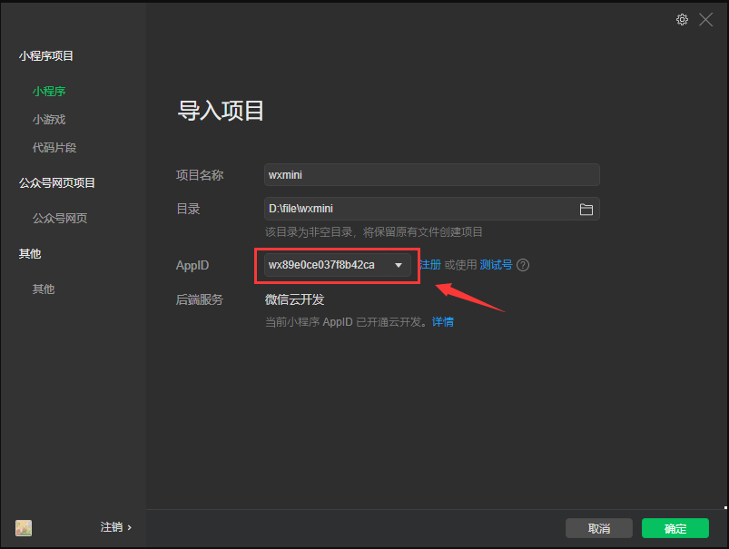 导入按钮,选择代码文件,并修改APPID为 自己注册的小程序的APPID。