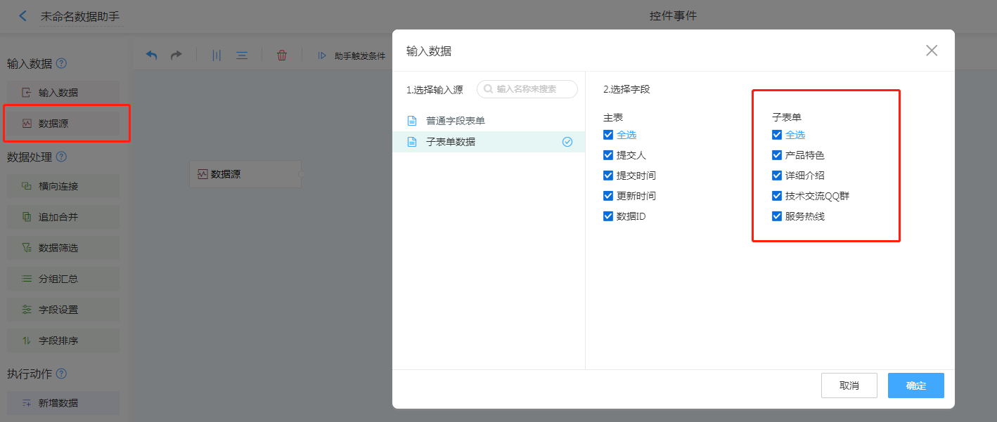 - 在输出表内将来源表单普通字段与子表单字段进行分离