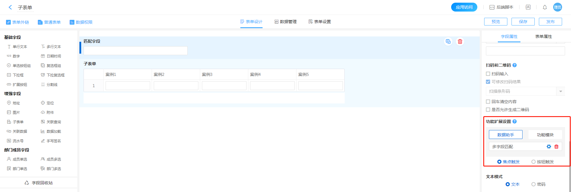 - 进入控件属性页面,或者计划任务配置页面(本案例以单行文本配置为例),点击进入数据助手配置页面。