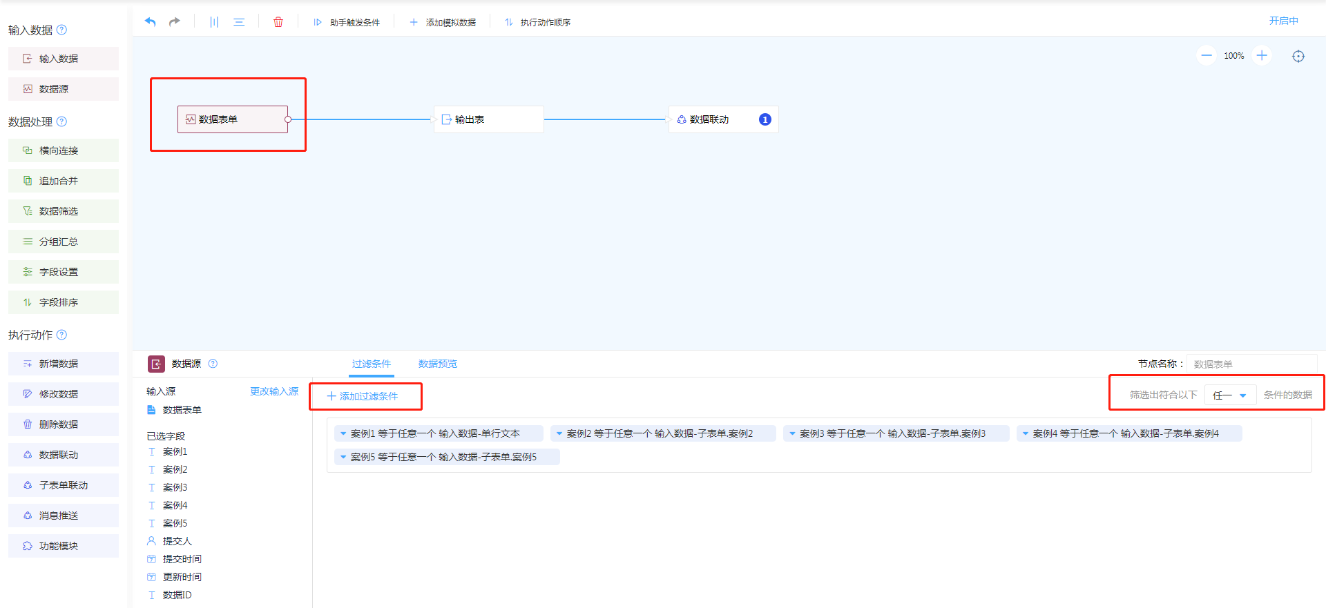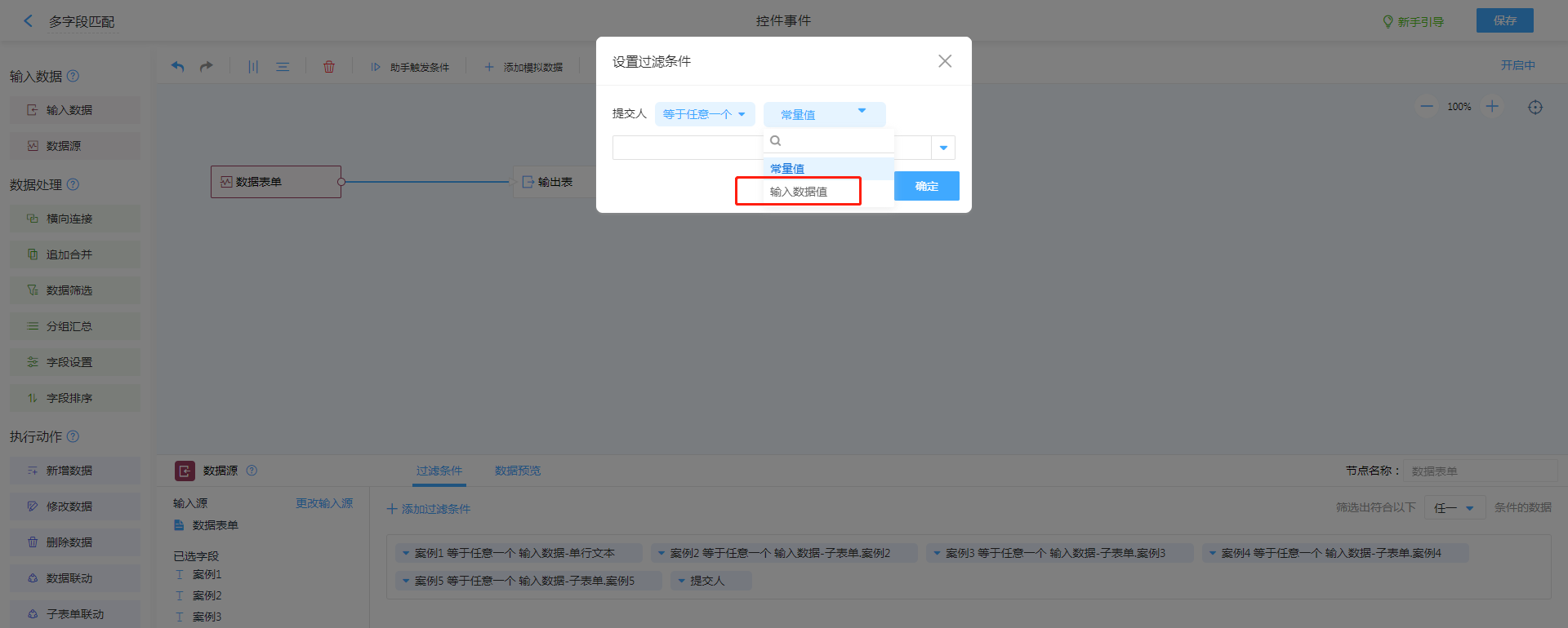 - 设置过滤条件,根据实际匹配条件进行过滤条件设置,需要注意条件等式右边需要选择“输入数据值”,并调整为筛选符合下列【任一】条件的数据。