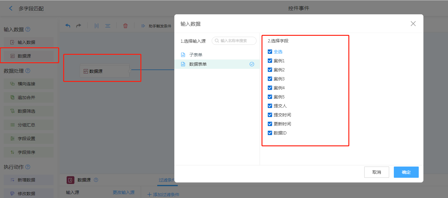 数据源,选择需要进行匹配的目标表单