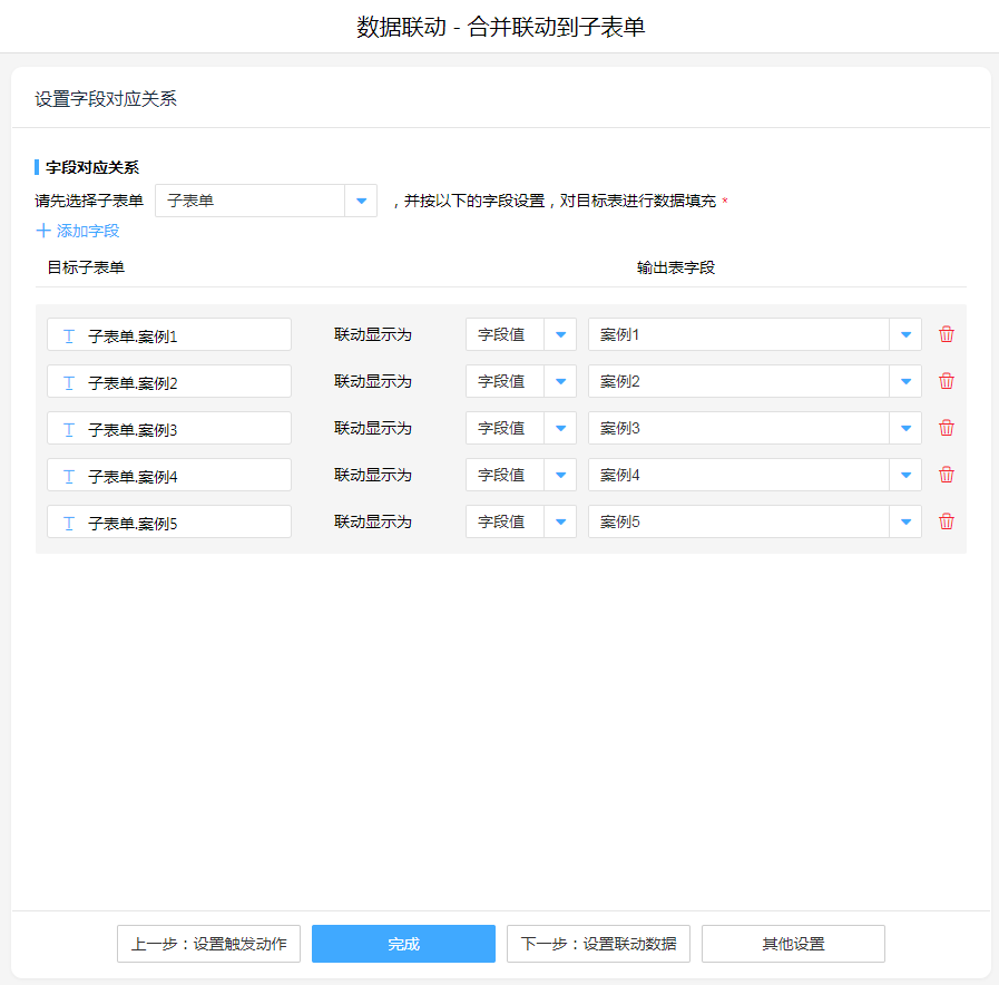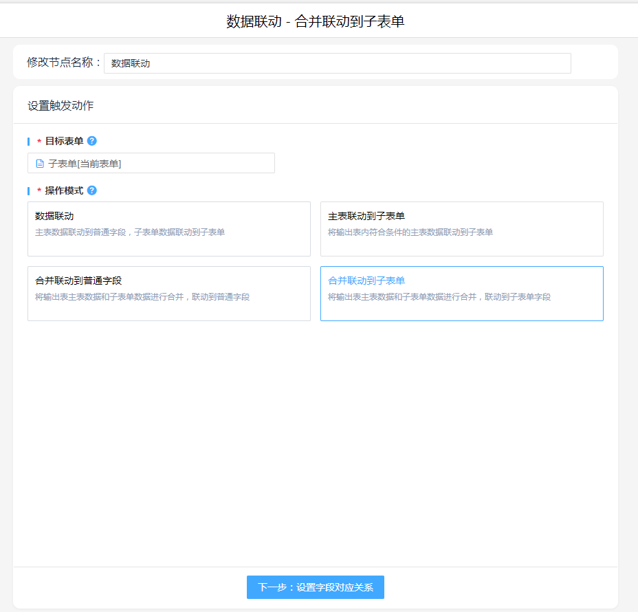数据联动,操作模式按照实际情况进行选择,关联字段联动关系