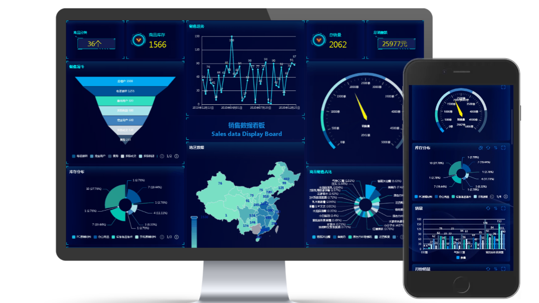 通过将销售数据转化为可视化图形报表,每个店铺的销售情况,无论是对于分类数据的汇总,还是对于销售数据的占比、趋势,都可以非常直观的展示出来。经营情况一目了然。