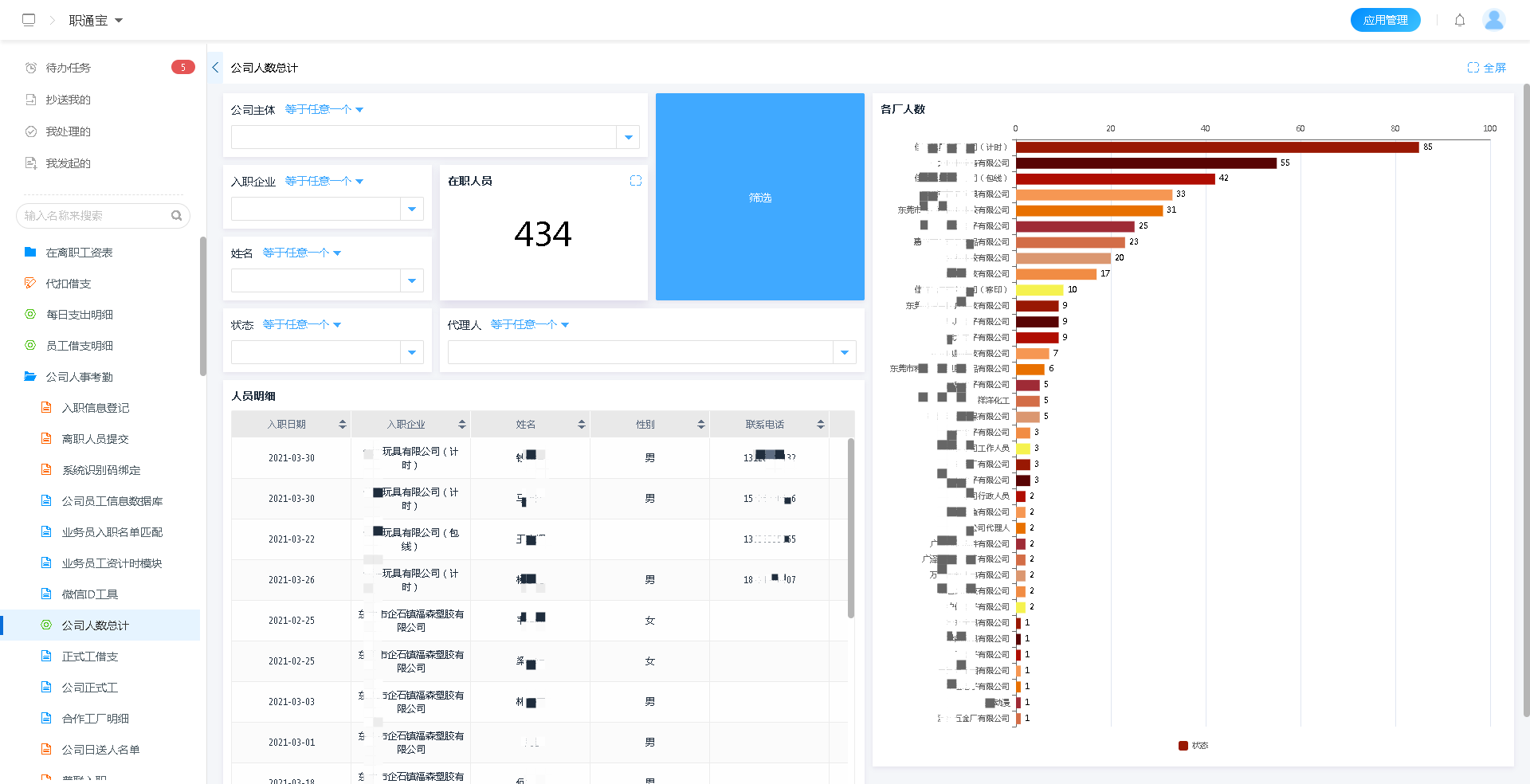3、利用微睿云的报表体系,实时统计所辖企业的在职人员、离职人员、人员入职渠道以及各种与人事相关费用的申报、使用、管理情况。所有款项收支,无论是明细还是汇总分析,借助多样化报表展示一目了然。