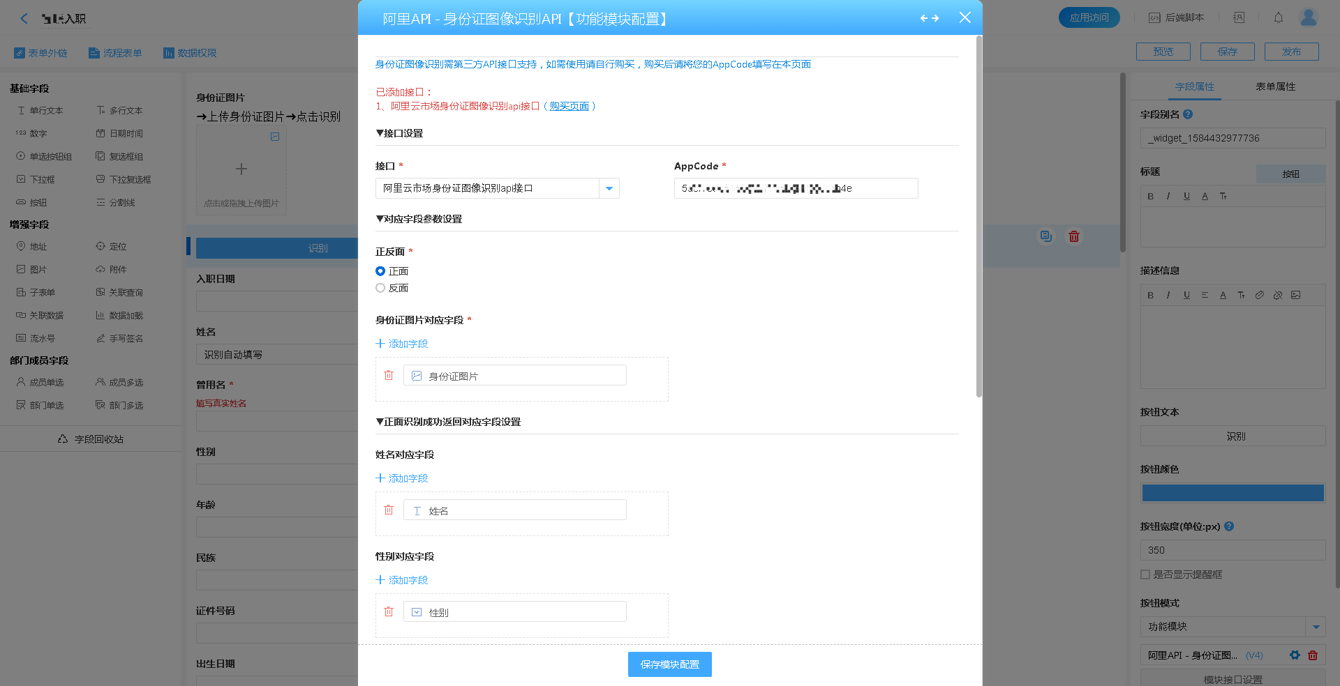 1、利用微睿云对接外部API的能力,全自动识别入职员工的身份信息,减少繁琐的个人信息输入步骤,大大提升了人事办事效率。