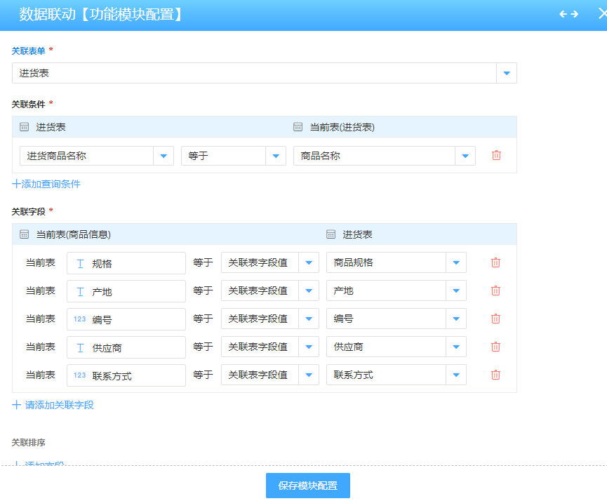 然后设置判断条件,如【进货商品名称】选项值与关联表单【商品表单】中【商品名称】控件值相等。