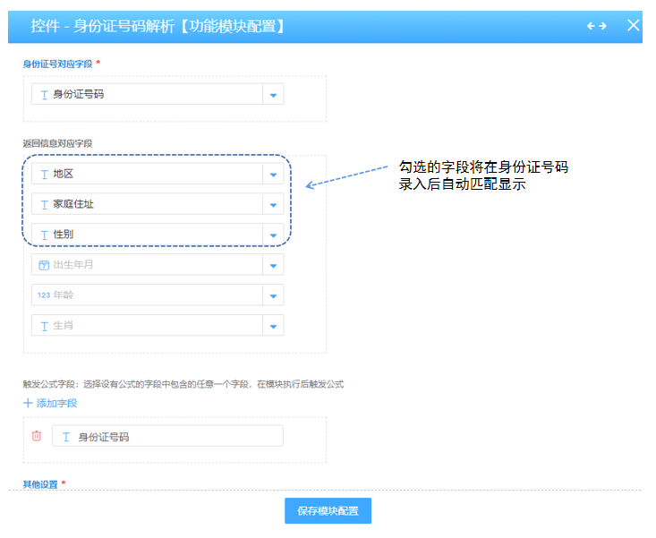 保存插件配置后,在人员信息录入表单中输入单一信息【身份证号码】后,可以快速返回设置中勾选的性别、地区、家庭住址,帮助工作人员更高效地进行人员信息的收集。