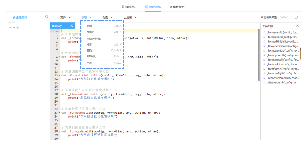诚然,功能插件通过python封装而来,如果想进一步优化应用微睿云也给与了代码在线编辑的权限。选中【插件源码】,编辑菜单中包含了一些常用功能并备注了快捷键,有代码基础的用户可以实现在线调试编辑代码。