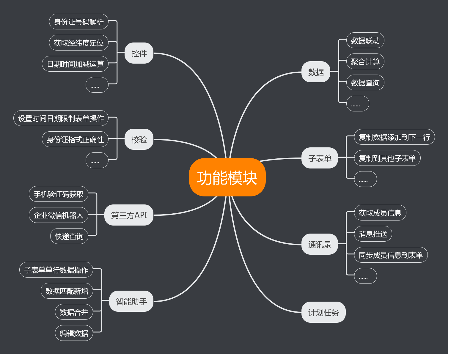 功能插件对于微睿云基础功能的辅助升级体现在表单控件能力的扩展、复杂多表的复合计算、第三方对接等多个系统维度,应用场景丰富,能够全方位渗透式的为定制化业务场景服务。