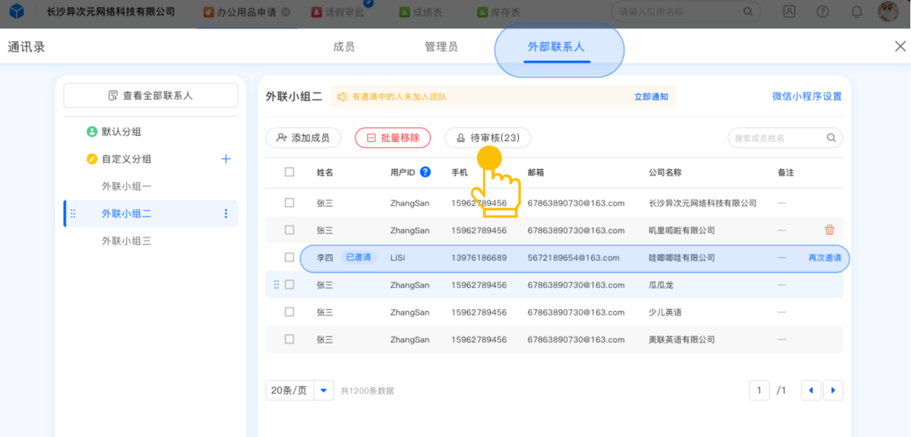 在企业通讯录中可以选择添加外部联系人并自由审核申请人员是否加入团队