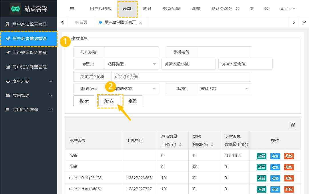 *时间段配置性能,适用于为团队管理员赠送配置 管理员登录后台—[表单]—[用户表单赠送管理]这个分类下,可以查看和管理所有用户的赠送和赠送记录情况。点击赠送选择需要赠送性能的用户账号进行自定义配置,提交后该用户账号在自定义赠送的时间期限内使用配置的性能,一般用于年费的控制,适用于商务版多团队型。