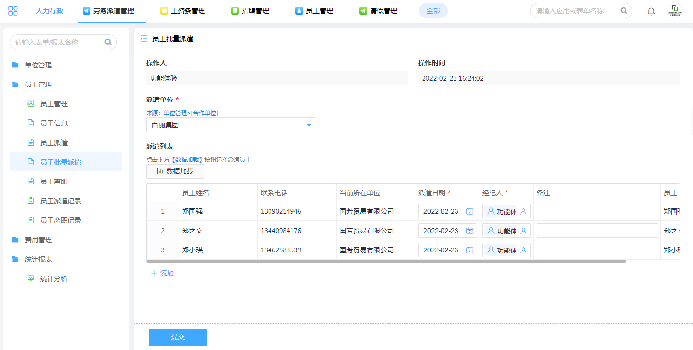 员工派遣的流程借助线上表单可以被完整记录,当需要操作较多人员的劳务派遣流程时,可以借助数据加载功能,批量勾选人员名单。