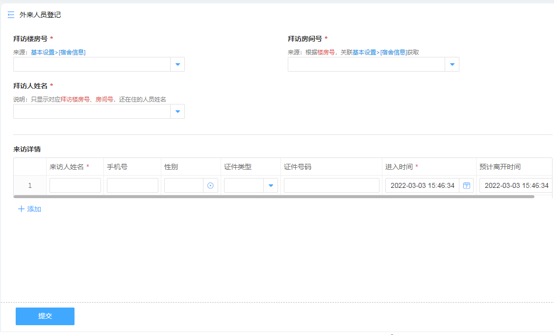 出于学生管理安全考虑,外来人员登记是必须流程,登记的信息包括拜访房间号、拜访人姓名、来访详情等等。