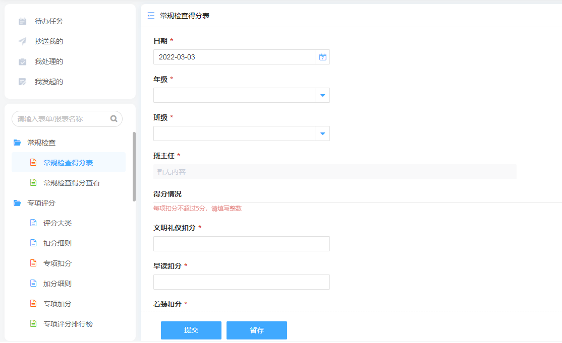 过去学校对于仪容仪表、卫生情况、做操情况的记录常用纸质方式记录,不利于信息的整理与回顾。使用电子表单录入更方便的同时,也可以根据日期、班级等参数进行筛选查看。