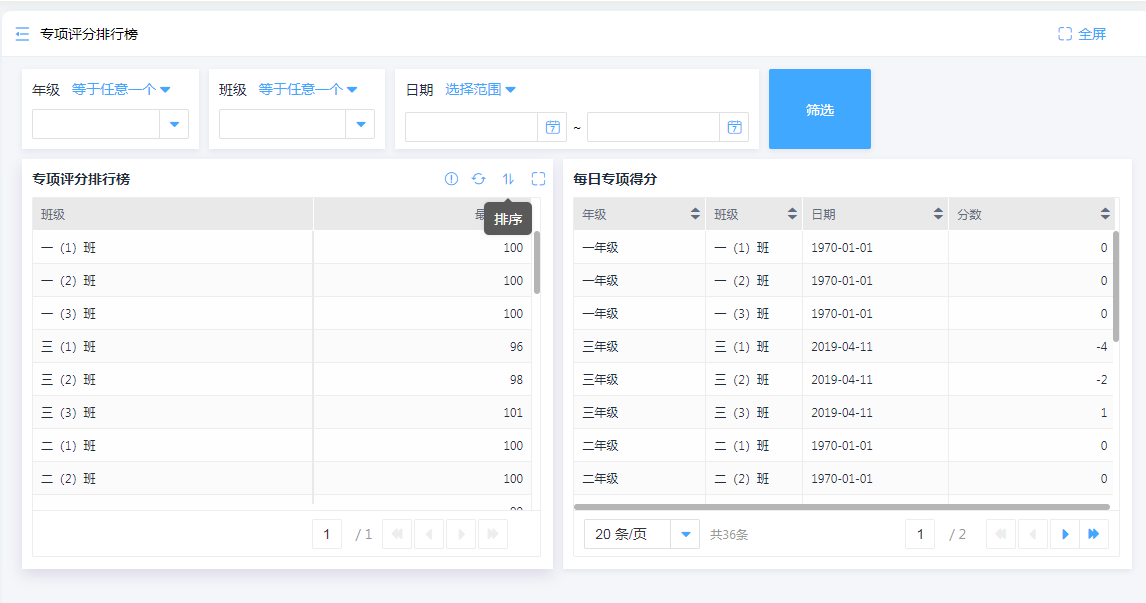 根据加分和扣分表单的提交数据可以制作评分排行报表,可以选择年级、日期、班级进行筛选查看或者一键排序。