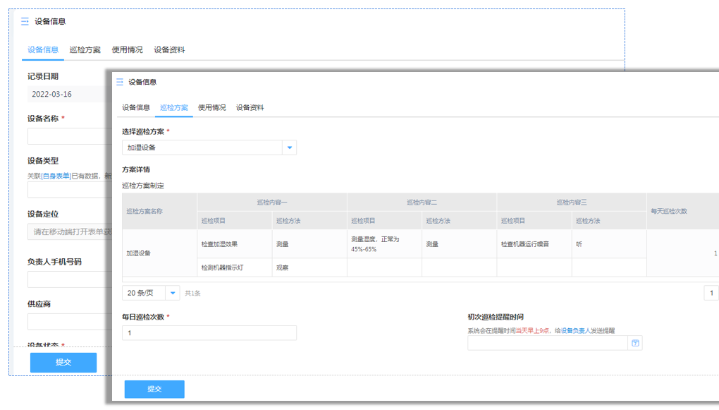 借助微睿云子表单功能可以同时录入或调阅与设备信息相关的多个表单内容,例如切换巡检方案表单可以确认巡检指标,减少检查纰漏。