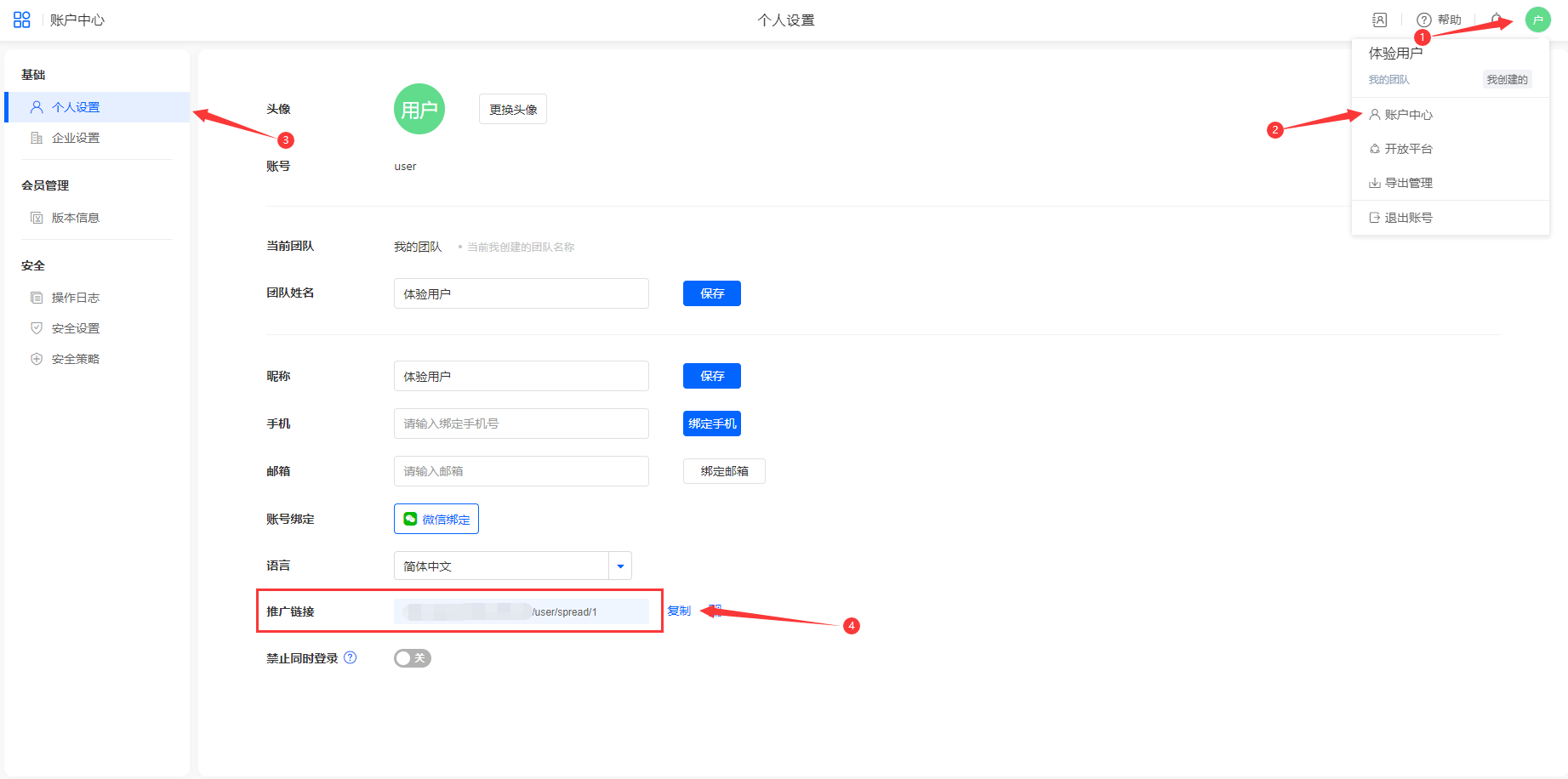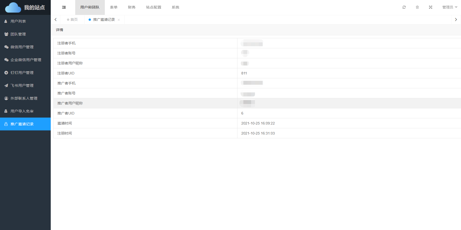 登录(https://私有云域名)进入账户中心获取推广链接,只有通过推广链接访问注册的用户才会进入到推广邀请记录里