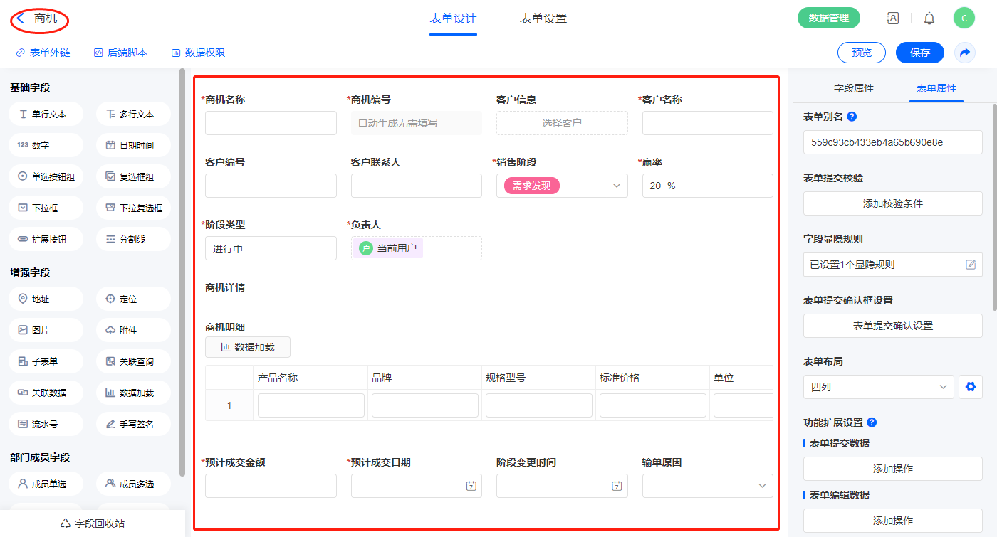 1)新建主表【商机】表单,字段设置如下:
