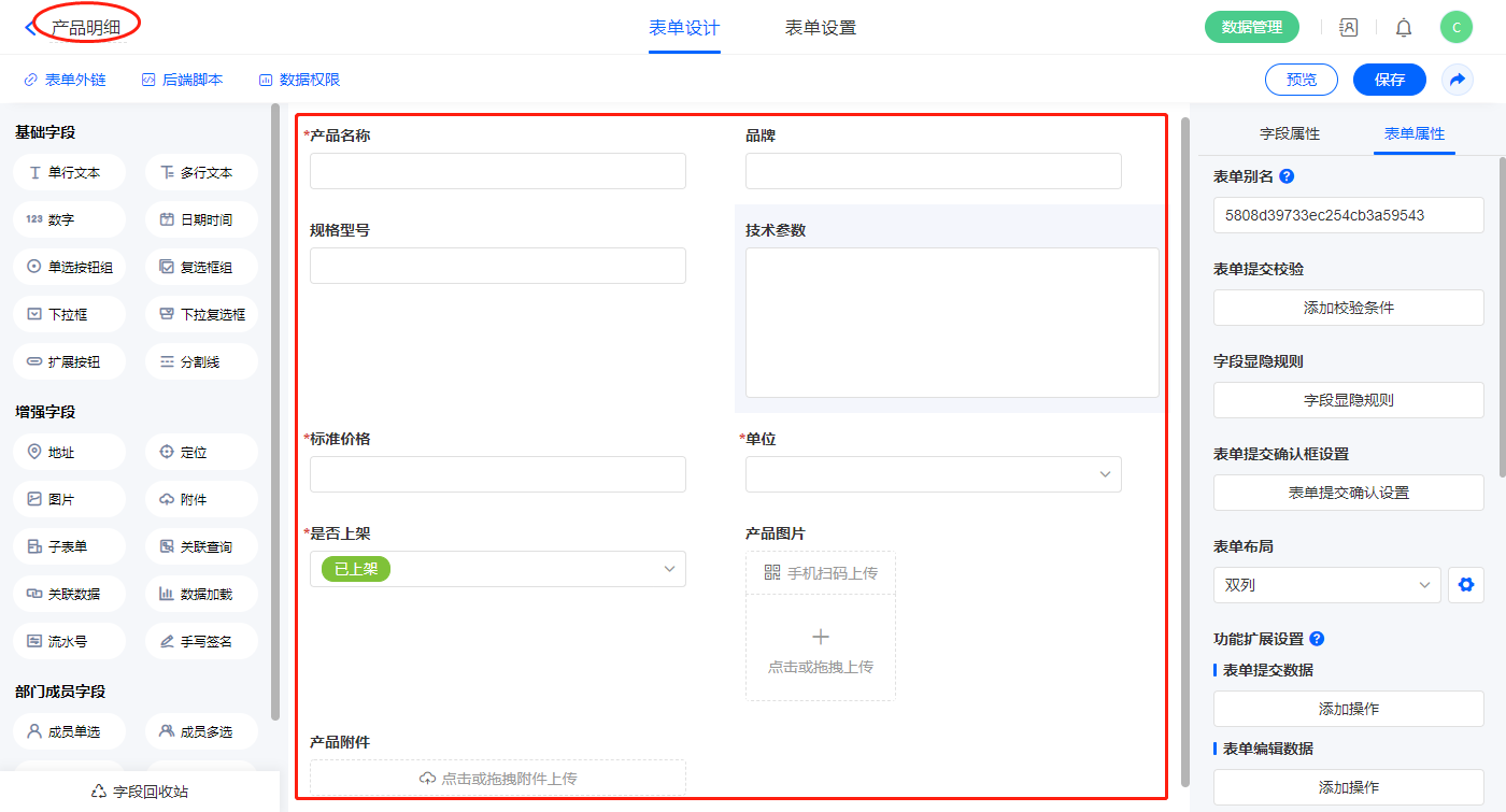 | 规格型号 | 单行文本 |