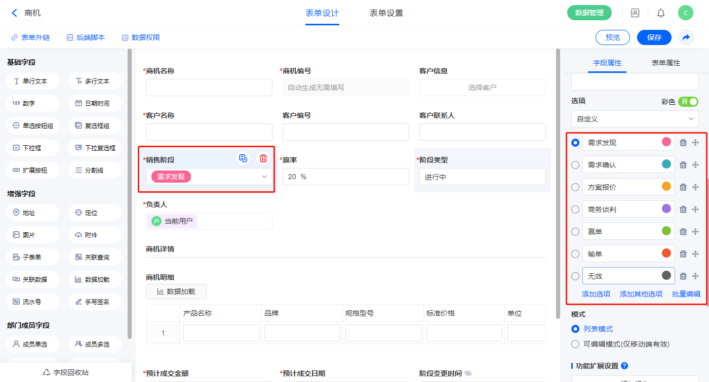 1)选中【销售阶段】字段,在选项中输入选项,并设置默认值为需求发现;