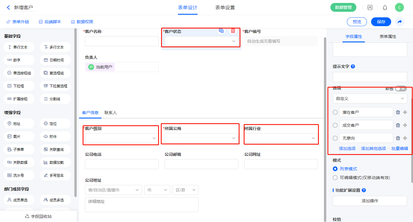 1)选中【所属公海】、【客户级别】、【客户状态】、【所属行业】字段,在选项中输入选项;