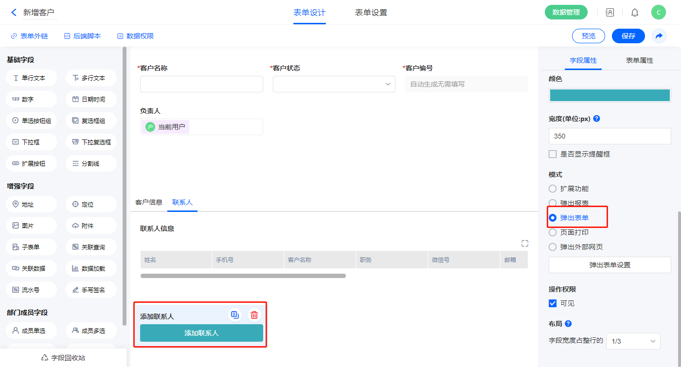 3)选择【添加联系人】扩展按钮字段,模式选择弹出表单;
