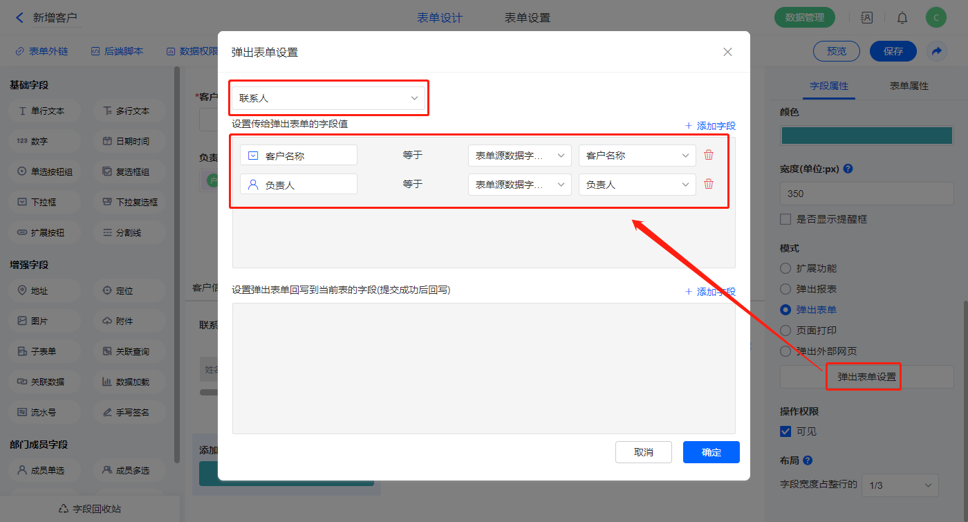 如图弹出表单设置为【联系人】并设置传给弹出表单的字段值;