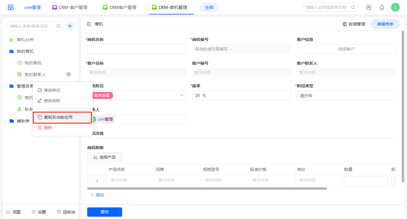 2)新增数据表菜单栏【商机详情】;