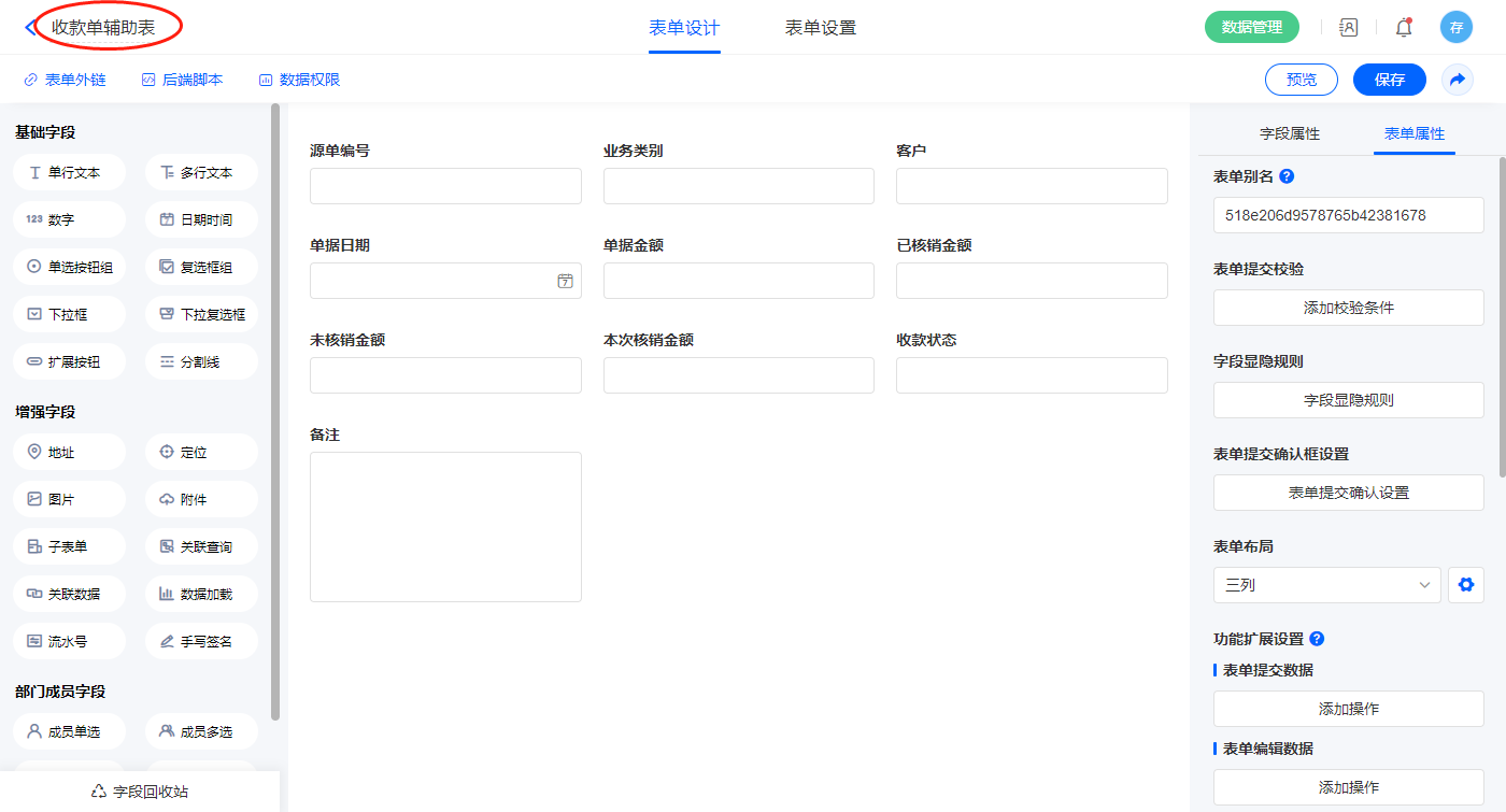 选择【收款状态】字段,设置默认值为公式编辑,设置公式:“IFS(本次收款合计价税合计,"全部收款",本次收款0,"未收款",(AND(合计价税合计>本次收款,本次收款!=0)),"部分收款")”;