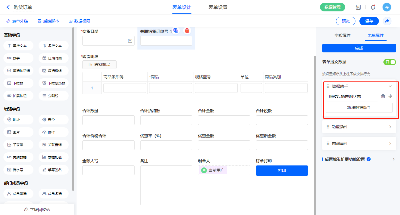3)该表单是流程表单,设置流程节点审核,该节点属性的节点权限提交设置一条数据助手,名称为修改销货单出库状态;