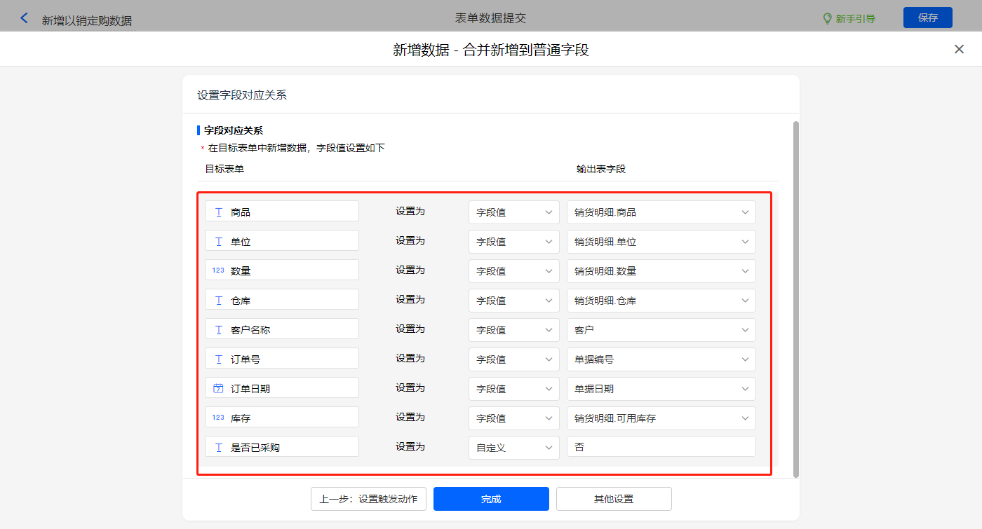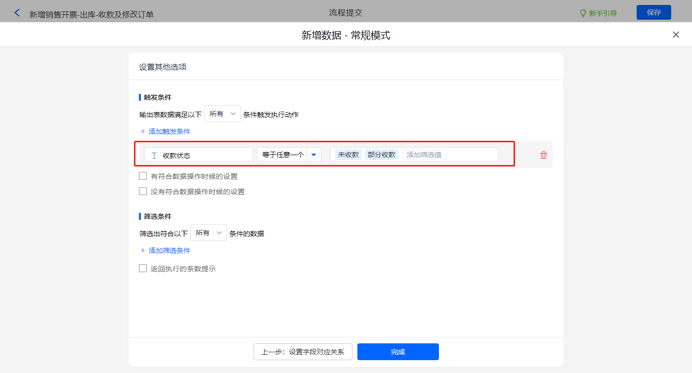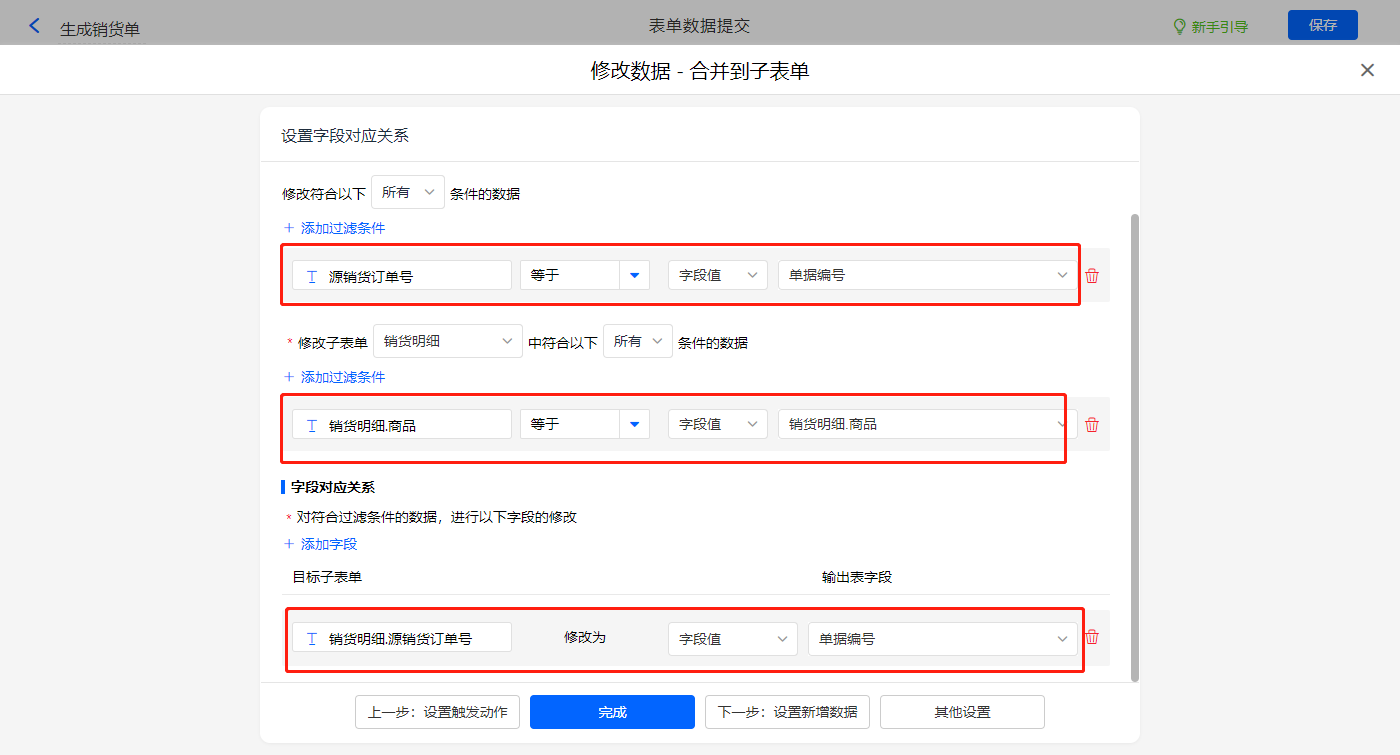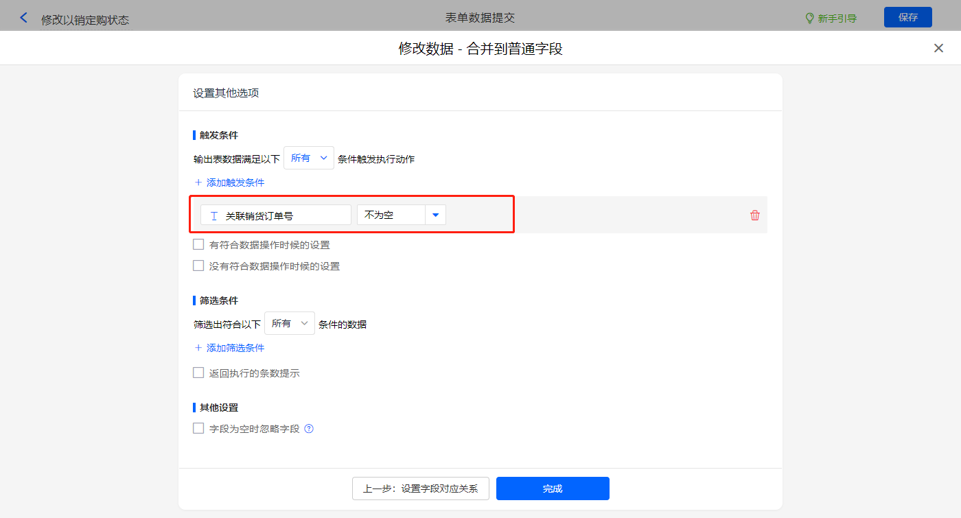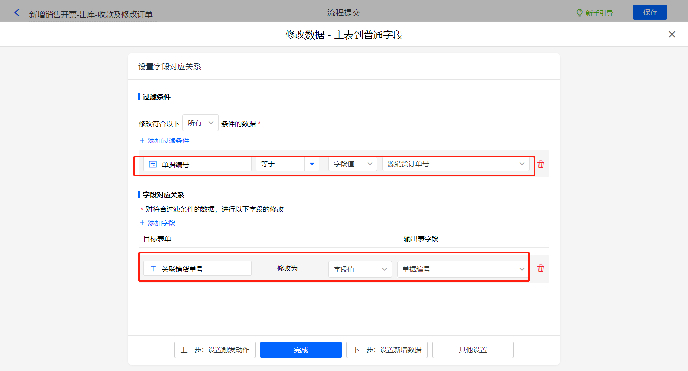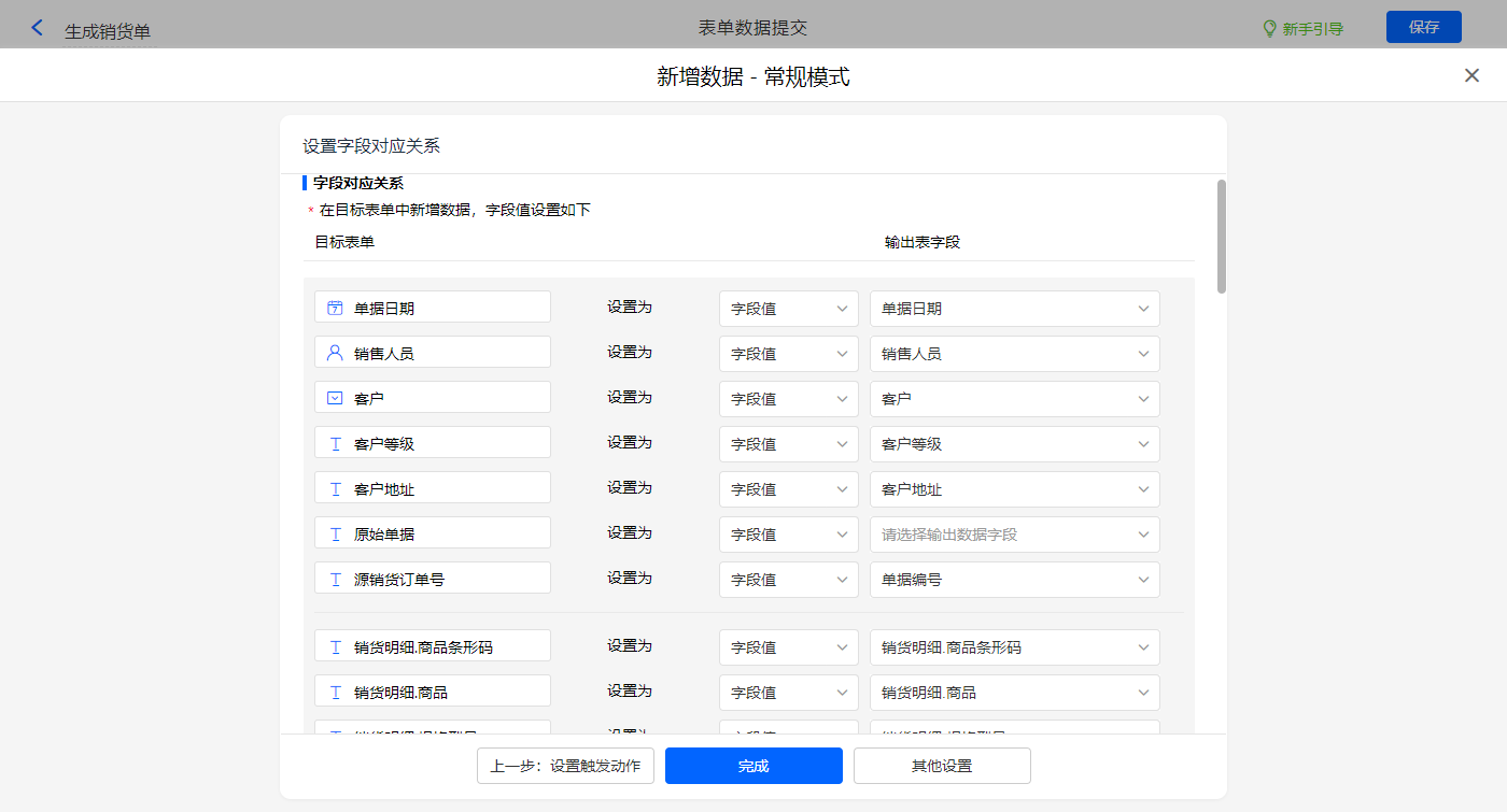 其他设置触发条件为【单据类型】字段等于销货,设置好点击【完成】并保存该数据助手;