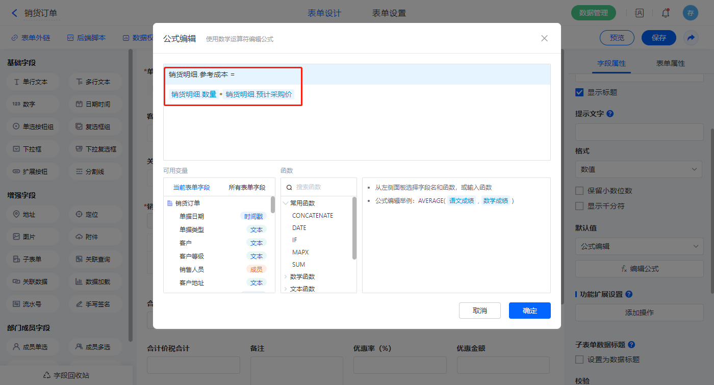 【本次欠款】字段默认值设置为公式编辑,如图设置公式;