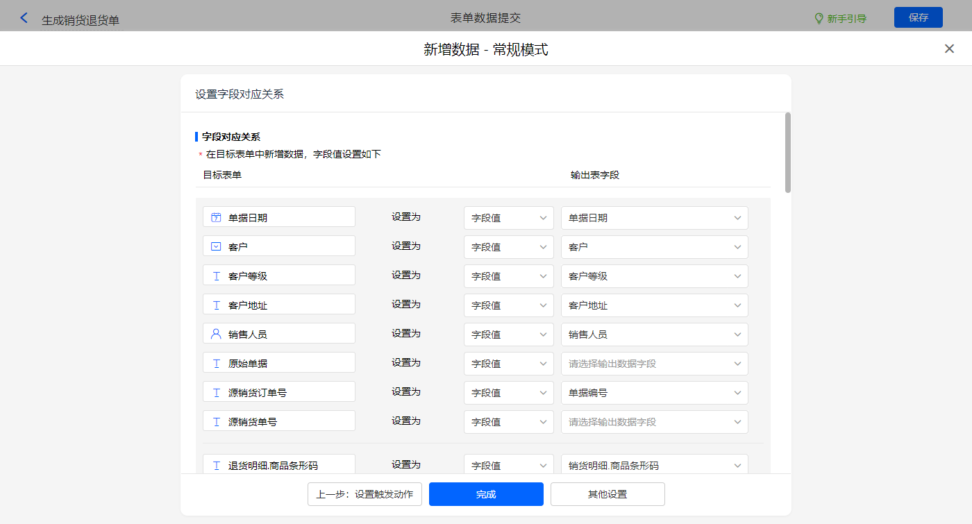 新增入库的数据助手,新增新增数据的执行动作,选择目标表单【销货退货入库单】,选择对应字段,设置好点击【完成】并保存该数据助手;
