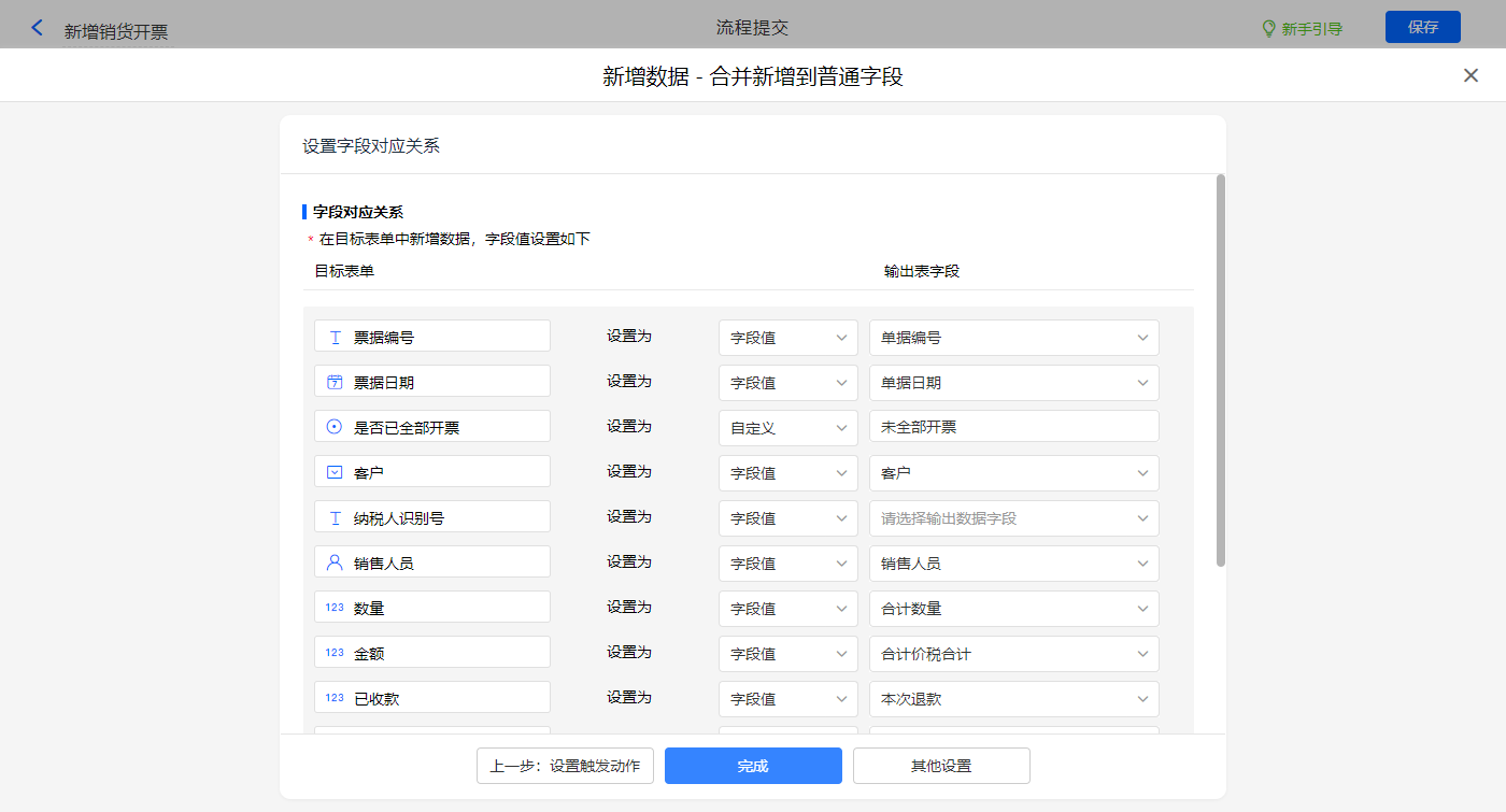 其他设置触发条件为【单据类型】字段等于销货,并设置发起新流程,设置好点击【完成】并保存该数据助手;