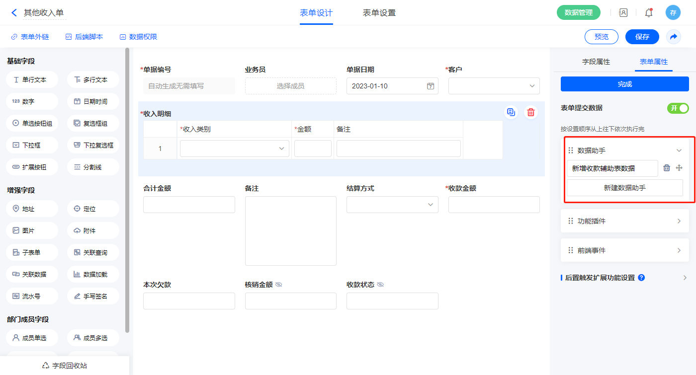 新增新增数据的执行动作,选择目标表单【收款单辅助表】,选择对应字段,设置好点击【完成】并保存该数据助手;