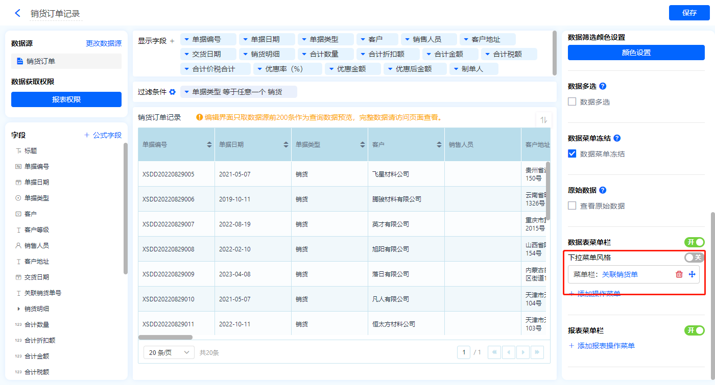 1)新增【历史销货订单】报表,用基础报表【数据表】展示数据源为表单【销货订单】的数据;