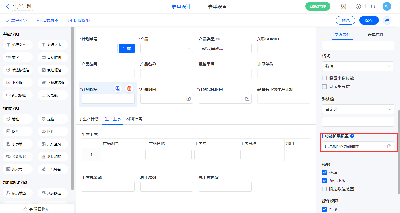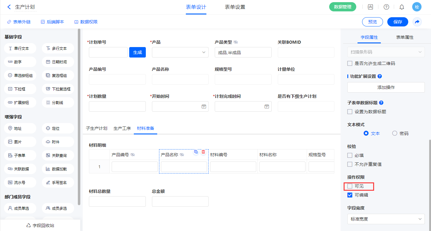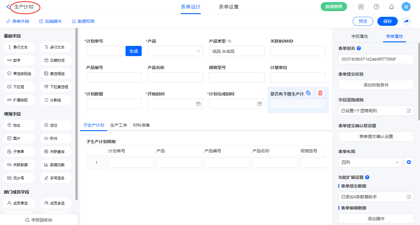 2.5、表单【生产计划】字段及表单属性设置