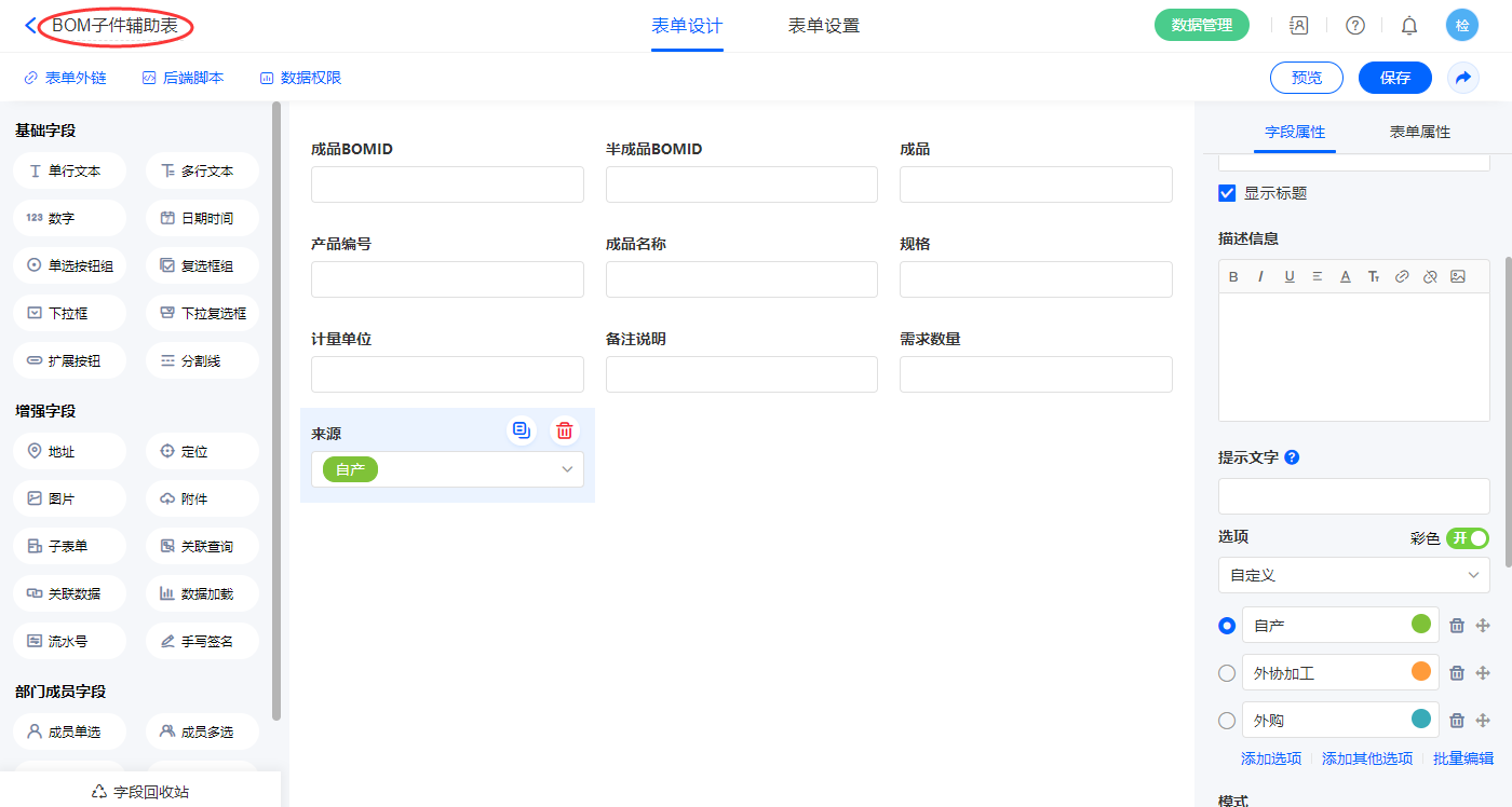 9)新增表单【BOM材料辅助表】,字段设置如下;