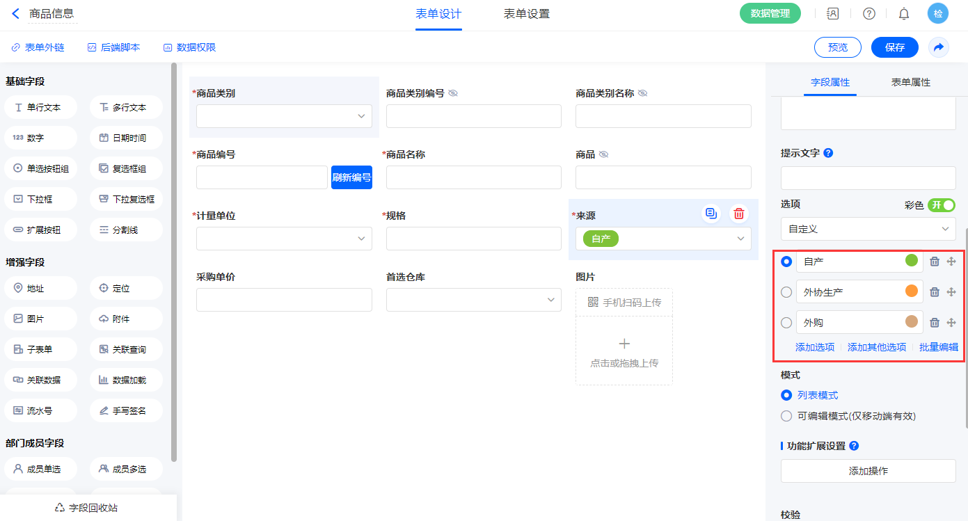 3)【产品】字段添加三个功能扩展;
